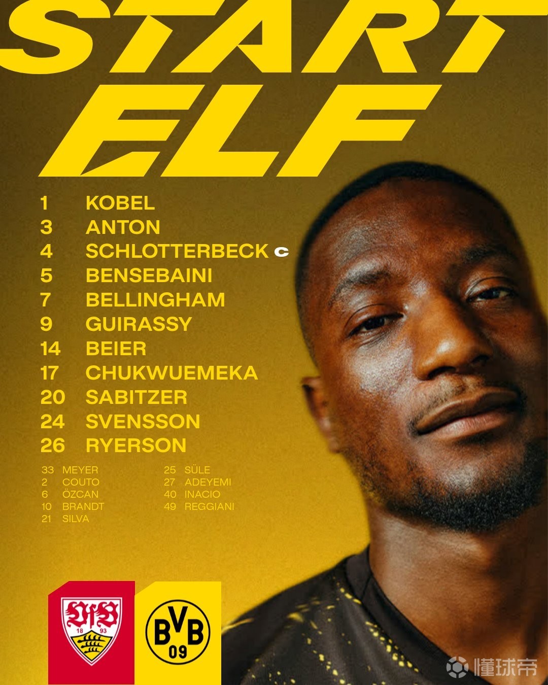 多特蒙德首发:1-科贝尔、5-本塞拜尼、4-施洛特贝克、3-安东、24-丹尼尔-斯文松、7-乔布-贝林厄姆、20-萨比策、26-瑞尔森、14-拜尔、17-丘库埃梅卡、9-吉拉西