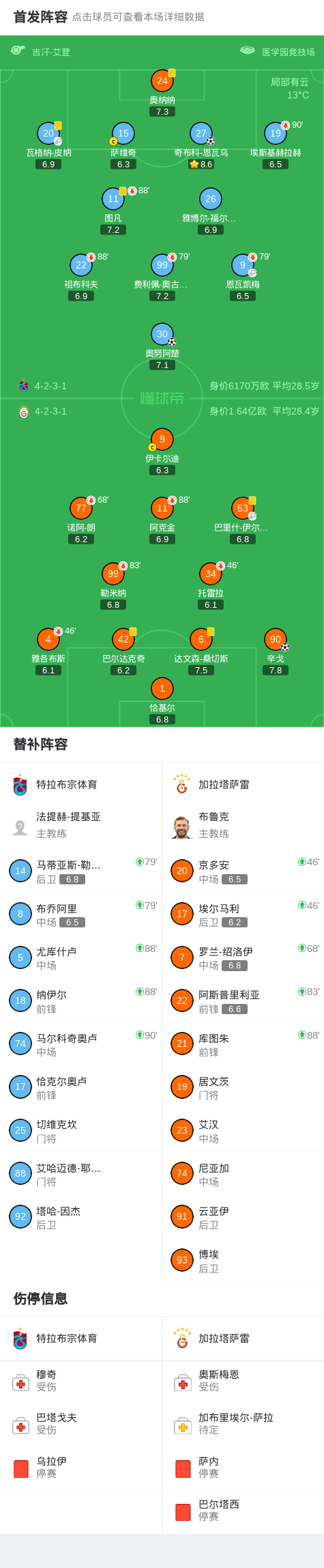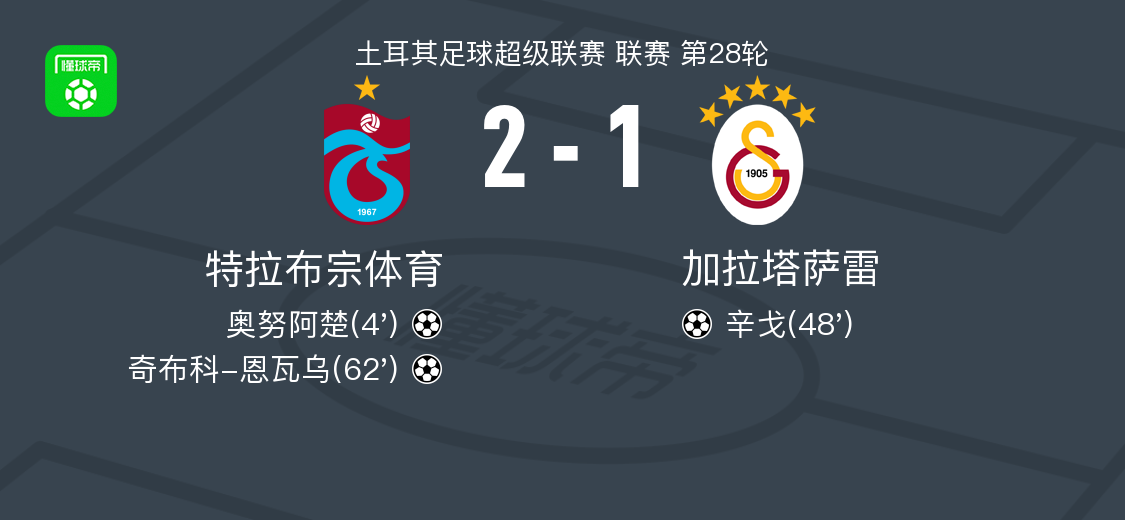 北京时间4月5日土耳其足球超级联赛 联赛 第28轮,特拉布宗体育主场对阵加拉塔萨雷。特拉布宗体育奥努阿楚破门,奇布科-恩瓦乌破门。加拉塔萨雷辛戈破门。最终比分特拉布宗体育 2-1 加拉塔萨雷。