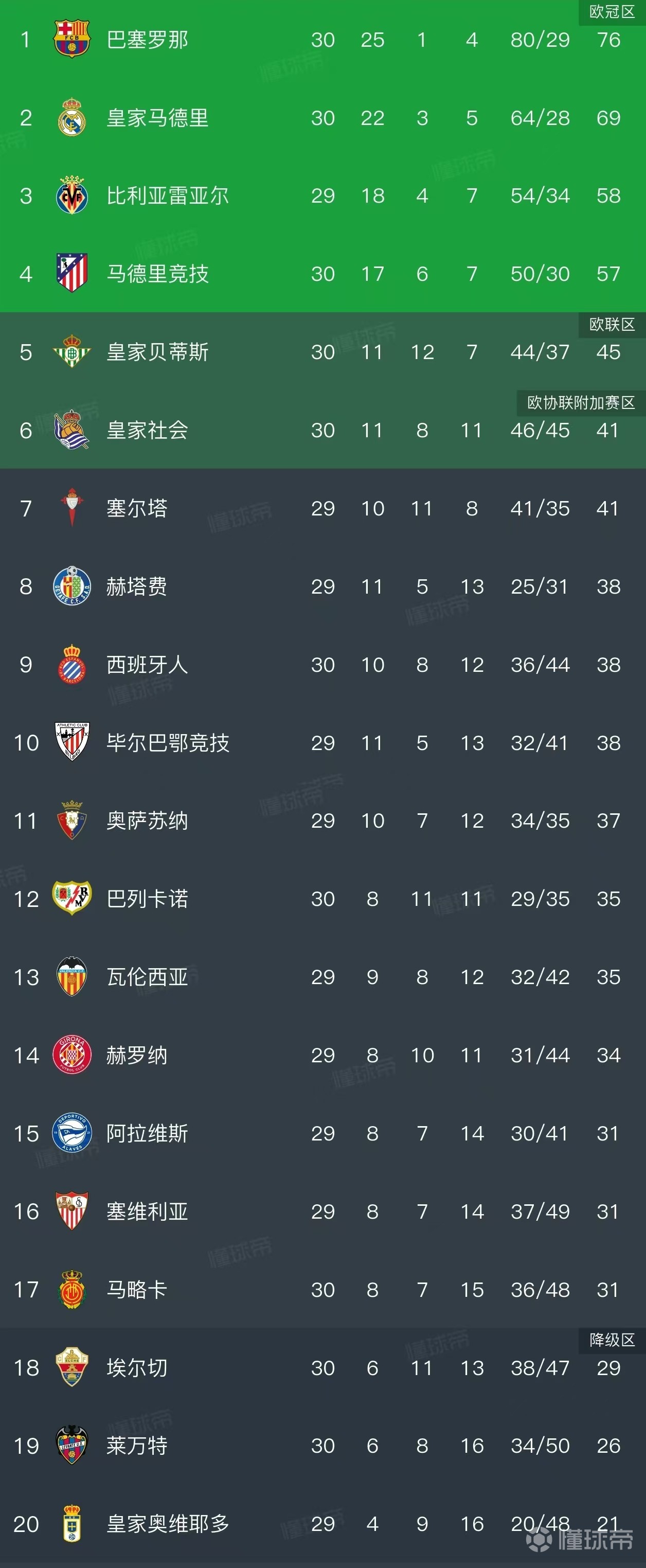 相比之下,保级大战的残酷性有增无减。阿拉维斯(29轮)、塞维利亚(29轮)与马略卡(30轮)同积31分,仅以微弱优势脱离降级区。而埃尔切(30轮29分)、莱万特(30轮26分)和皇家奥维耶多(29轮积21分)则深陷降级区。