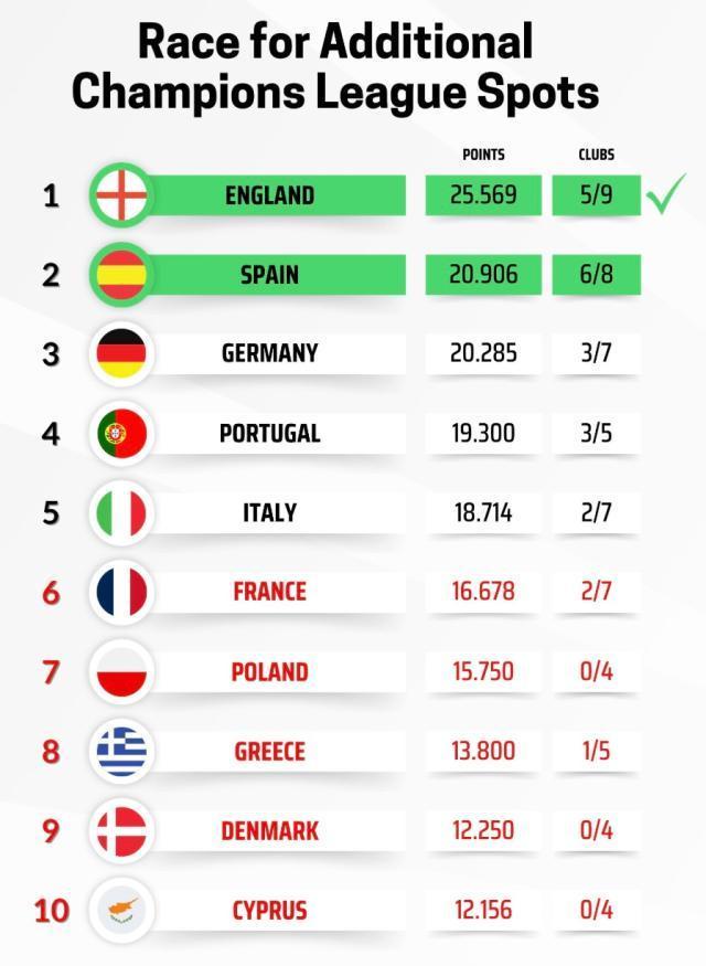 本赛季欧战成绩最好的两个联赛将各获得一个下赛季的欧冠名额,英超在本周阿森纳击败里斯本竞技后,已提前锁定一个,剩下一个主要由西甲和德甲竞争。目前西甲仍以一定优势领先德甲,且暂时有6队存活,不过本轮过后皇马、巴萨和塞尔塔都有较大可能出局。而德甲在三级欧战各剩1队,拜仁、弗赖堡和美因茨晋级前景乐观。