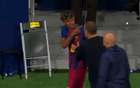 波兰人在第87分钟的进球点燃了所有巴萨球迷的热情,唯独拉明·亚马尔除外。这位19岁小将没有庆祝9号的进球,他的队友兼好友库巴西还凑到他耳边说了些什么。这位拉玛西亚青训营培养的前锋显然心事重重,这种情绪在终场哨响时爆发了。