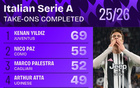 本赛季意甲成功过人榜:伊尔迪兹69次居首,帕斯55次排第二